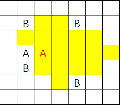 在某战棋类游戏中,游戏地图采用a行b列正方形的格子表示。我方(用A表示)和敌方(用B表示)的每支部队都放置在地图上的某一个格子里,一个格子最多只能容纳一支部队。每支部队都有各自的行动力,表示该部队每次行动中,最多可以在地图上移动多少个格子。 移动的规则:1、只能朝四个方向(上下左右)移动,每移动一格耗费1点行动力;2、最终停留的位置上不能有己方或敌方的部队;3、不能移动到敌方的部队所在的格子,可以移动到己方的部队所在的格子(但不能与规则2矛盾,即必须还可以继续移动);4、如果移动到的格子的四个方向(上下左右)有敌方的部队,那么结束移动,即使有未消耗完的行动力;若我方部队初始位置周边有敌方部队,不会导致我方部队无法移动。 例如在下图中,假设我方部队(红色的A)的行动力是4,那么所有黄色的格子都是A可以移动到的敌方(包含原地不动)